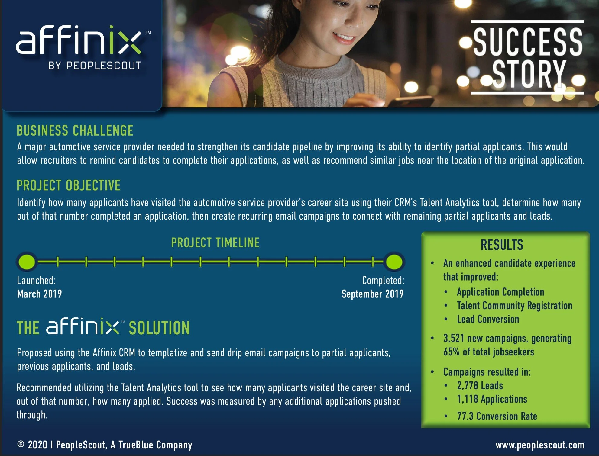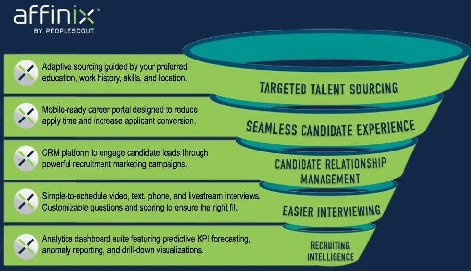 Affinix represented a major strategic shift for Peoplescout, an external staffing provider for large corporations and event staffers, like Starbucks, Chick-Fil-A, and Aramark. The new platform digitized their candidate pipeline services and repositioned the company as a SaaS provider.