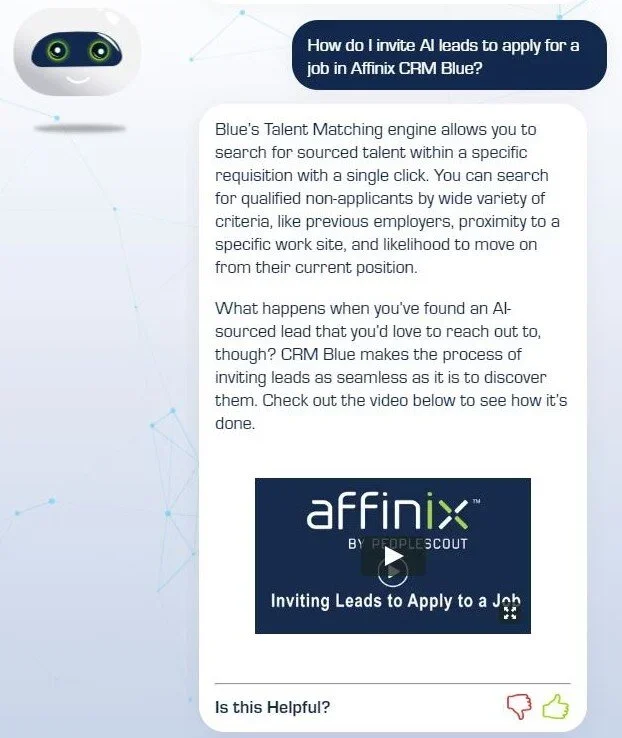 The process felt like editing a manuscript by shredding it and gluing it back together. I was concerned the decentralization of what was a single source of truth would lead to client frustration if they unknowingly referred to the wrong documentation. In order to mitigate this potential hairiness, I worked with Peoplescout developers to add a chatbot to Affinix so users could quickly pull the correct resources. Here’s an example interaction: